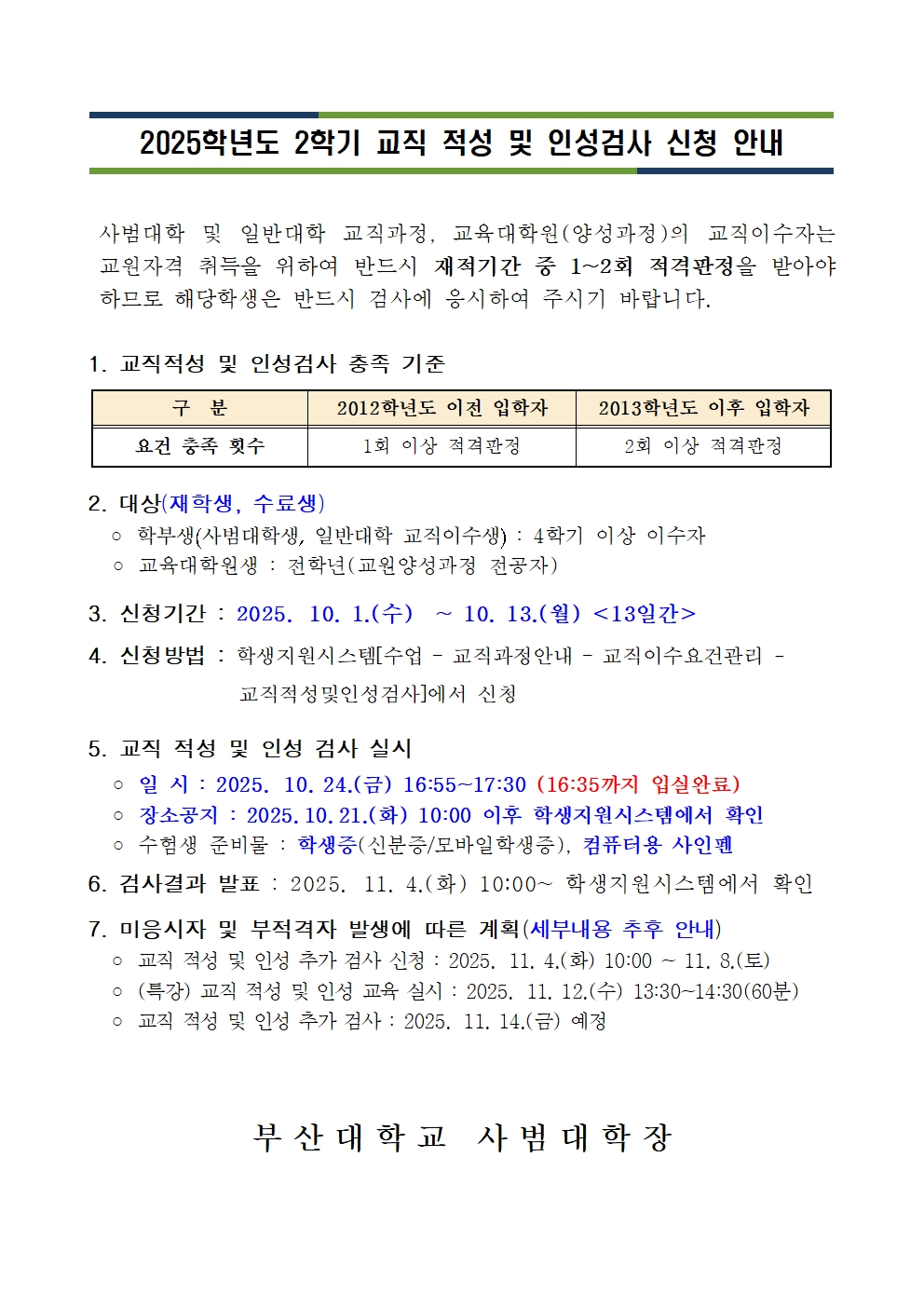 2025학년도 2학기 교직 적성 및 인성검사 신청 안내