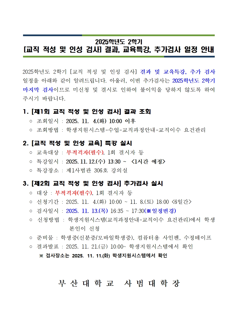 2025학년도 2학기 [교직 적성 및 인성 검사] 결과, 교육특강, 추가검사 일정 안내