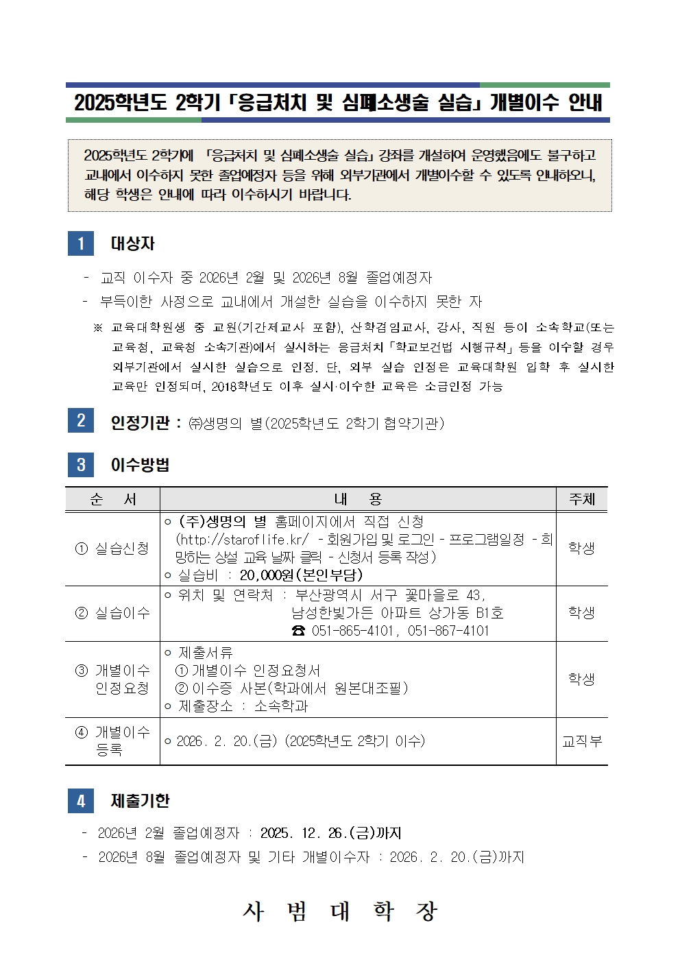 2025학년도 2학기「응급처치 및 심폐소생술 실습」개별이수 안내