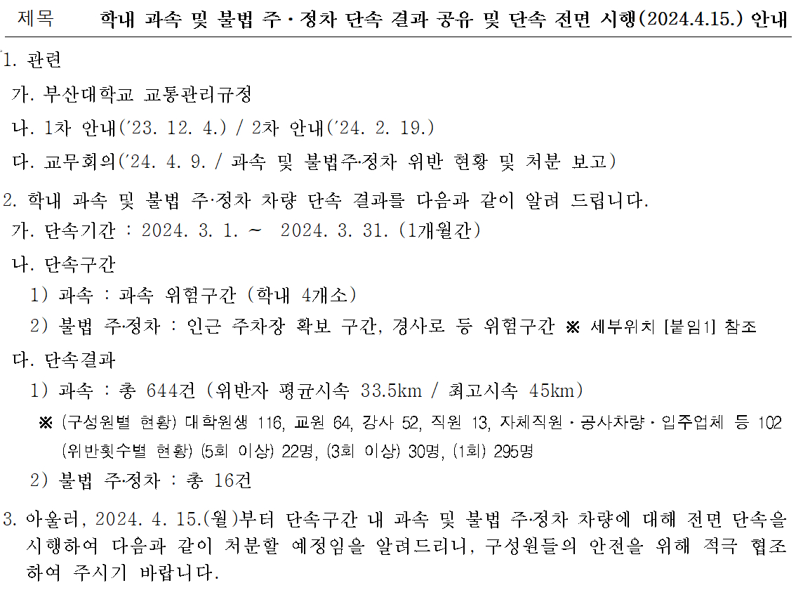 학내 과속 및 불법 주정차 단속 결과 공유 및 단속 전면 시행(2024.4.15.~) 안내