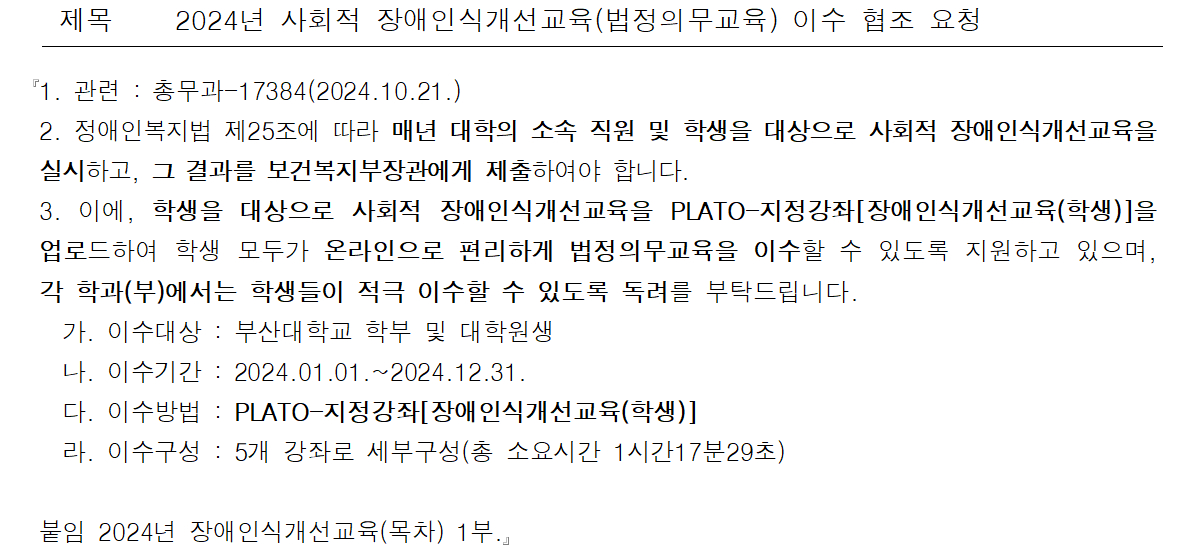 2024년 사회적 장애인식개선교육(법정의무교육) 이수 협조 안내