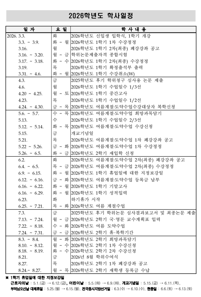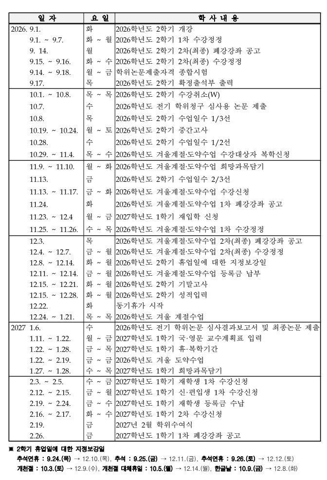 2026학년도 학사일정 및 학사력 알림
