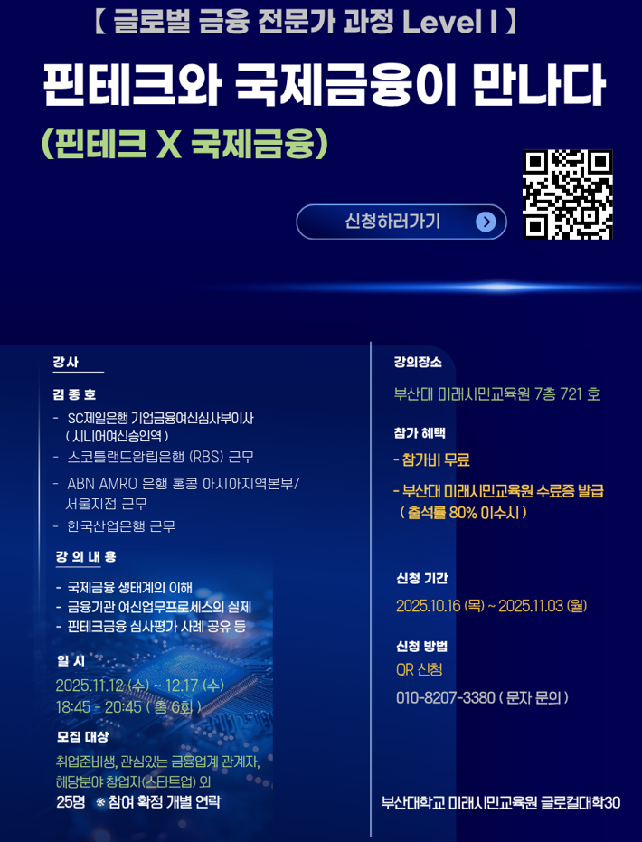 fnctId=bbs,fnctNo=7222 분류 일반 작성일 2025.10.16 수정일 2025.10.27 작성자 허미진 조회수 20 [무료_글로벌 금융 전문과 과정 Level 1(핀테크 *국제금융) 교육 신청 안내(~11.3. 월 까지)_수정 [QR코드 신청] 첨부파일 첨부파일이(가) 없습니다.